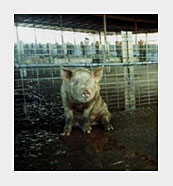 "I say that this particular pig is alone in the holding pen, but this is not strictly true. To the right of the photo, and cropped out of the print on my desk, is the corpse of a pig which has died in the pen, a common event, apparently, at every point in the transportation of these beasts from the "farms" where they are raised and fattened to the omega point at which their vital signs become moot. These bodies are winched out of the boxcars, trucks, pens, whatever, and rendered back into feed for the next generation of hogs. In this way the system is nearly without waste. The pig in my photo is a "downer" pig, too sick, according to the caption, to rise to his feet and join his brothers and sisters out the gate of the pen and into their holocaust. Ironically, he appears for the time being to be the only survivor. He sits on the filthy cement floor, bewildered, terrified and utterly, unimaginably alone."