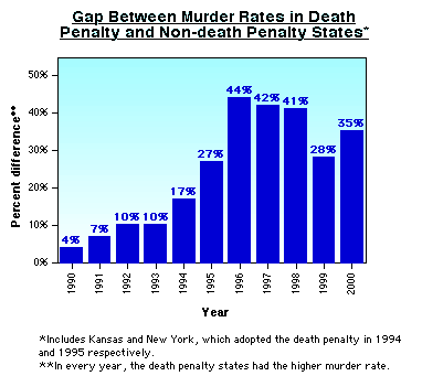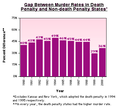 4 I have in front of me an example of statistical flimflam in the form of a column by Jeff Jacoby of the Boston Globe, who cites favorable statistics from his almanac. You can neither dispute nor extrapolate from the particular numbers he chooses, notably the dramatic reduction in the overall U.S. murder rate between the resumption of executions in 1982 and to the present. The graphs below illustrate what he fails to tell us, i.e. that this decrease occurred primarily in states which did not reintroduce the death penalty. Additionally, in every year shown, death penalty states had significantly higher murder rates. Wrong conclusions can be the result of omitted information such as the above, or highly selective facts such as the decline in total murders in Harris County (Houston), Texas during the same period - a 72% decline! Harris county is indeed to be congratulated for lowering its homicides from 701, a whalloping 3+% of total U.S. murders for that year, down to a merely frightening 241. (If it weren't for the death penalty, it might have been necessary to quaranteen Houston off from the civilized world!) Like tempers in that neck-of-the-woods, the murder rate tends to show unpredictable fluctuations. Equally dramatic figures are available in support of every possible outcome. You've got to have all of the numbers in front of you, or somebody is going to come along with only part of the truth and try to sell you some kind of snake oil. And the perennial fact remains that when you actually do have the entire almanac of figures in front of you, you will not find that the hangman is saving any lives.