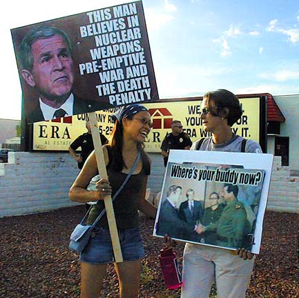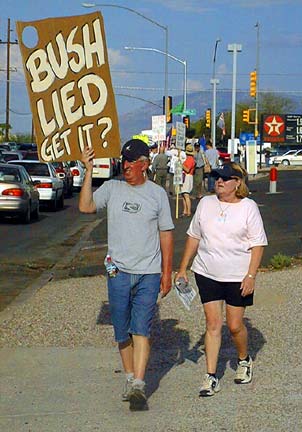 After attending the Bush demonstration at the GOP Headquarters yesterday, and then reading your account of things today, I'm happy to report that your CQ (credibility quotient - the number by which your figures must be multiplied or divided to arrive at the truth) has improved since last January's peace rally. Your estimate of the number of people who turned out in critical response to our mendacious leader's Mt. Lemmon photo-op was 500, whereas according to individuals and groups who were there purely to count heads the actual number was 850 (present at once, at the height of the event, not counting those who left early or came late.) So your CQ is 1.7, down from 4 earlier in the year when you simply reported a wholly bogus police estimate.