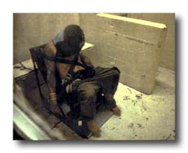 Photo: The Punishment Chair at the Maricopa County Correctional Facility in Phoenix, Arizona, used by Sheriff Joe Arpaio as a disciplinary tool. Hooded prisoners are strapped into a wooden "chair," wrists bound to prevent scratching. Inmates' trousers are pulled down, and the device is located over a toilet hole, so that immobilization can be continuous for 48 hours or more. This photo was taken in 2001, and was published in a Harper's Magazine article of that year titled "The Toughest Sheriff in America." The practice is not considered torture, and Sheriff Arpaio is sufficiently popular in Arizona that he has been encouraged to run for Governor.