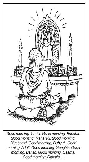 The other act of compassion however, and more urgent in my thinking, is to make George stop killing people as quickly as we can. The family record is 100,000 (killed) and young George must be halfway there already. Those now and future dead are also souls, each one of them just as important as Ol Dubyuh, God bless him. It is a case of one particular part of the Great Oneness killing off thousands of other parts of the Great Oneness like a ravening beast. Certainly we don't want to aggravate the negative energy of it all, but in the meantime, while we're waiting for the positive juju to make it from our Puja tables to Bush's brain, or just on the off chance that the resuscitation doesnt work, that his heart doesnt fill up with light and that he just keeps on acting that way, I would still propose that we keep a side prayer going, on behalf of all the countless people who might thereby be spared, for the universe to send some kind of truck to hit him.